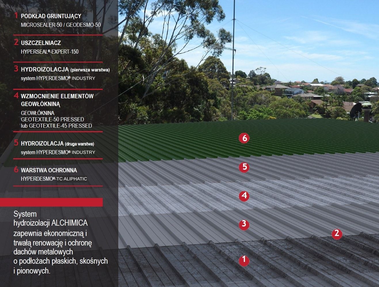 Powłoka ochronna (top-coat) w systemie HYPERDESMO© jest stosowana opcjonalnie w celu podnesienia parametrów refleksyjności promieni słonecznych do SRI 102 (parametr przekraczający wymagania stawiane tzw. chłodnym dachom) oraz podniesienia odporności membran poliuretanowych rodziny HYPERDESMO© na obciążenia eksploatacyjne z P1 do P3.